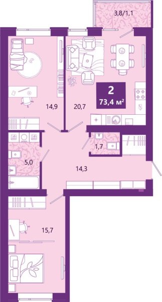Комнаты - раздельные. предчистовая. Серия дома - Индивидуальный проект. Продается 2-комн. квартира с предчистовой отделкой в ЖК "Сиреневый бульвар" на 4 этаже. Общая площадь: 74.4 кв.м., жилая: 30.6 кв.м., площадь просторной кухни-столовой: 20.7 кв.м. Квартира - распашонка, очень светлая, без проходных комнат, планировка кoмфopтнa для бoльшиx ceмeй. В квартире один балкон, один совмещенный и один раздельный санузел. Высота потолков 2.7 м.