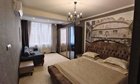 Кухня-столовая имеет встроенную кухонную мебель с полной комплектацией бытовой техники: встроенные холодильник и посудомоечная машина, варочная поверхность, духовой шкаф, кондиционер. У окна обустроена зона отдыха, где имеется кофейный столик, ортопедический диван и имеется вид на Парк Победы и море.
